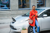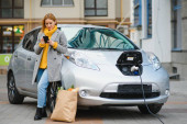 Korzystanie ze smartfona podczas oczekiwania. Kobieta na stacji ładowania samochodów elektrycznych w ciągu dnia. Nowy pojazd.