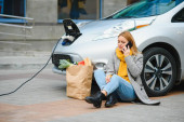 Kobieta ładująca elektrosamochód na stacji benzynowej