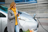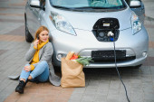 Kobieta ładująca elektrosamochód na stacji benzynowej