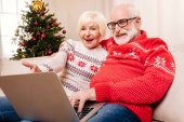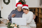 Szczęśliwy starzec mężczyzna i kobieta w kapeluszach Świętego Mikołaja i trzymając laptopa izolowane na białym tle