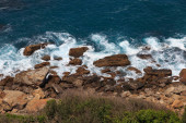 Widok na Ocean Atlantycki i wybrzeże Maroka w słoneczny dzień.