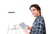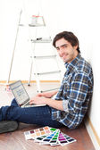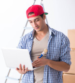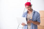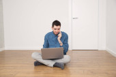 przystojny, młody człowiek w jego nowe mieszkanie za pomocą laptopa