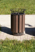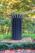 Czarny kosz na śmieci w parku z zamazanym naturalnym tłem