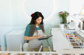 Portret młodej białej kobiety sprzedającej ciasteczka i słodycze. Mały biznes cukierni sklep z pamiątkami.
