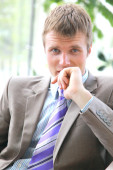 portret uśmiechający się przystojny młody biznesmen siedzi na krześle w gabinecie