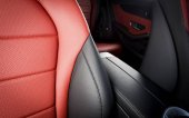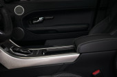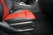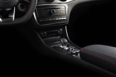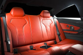 Nowoczesne luksusowe wnętrze samochodu - kierownica, dźwignia zmiany biegów i deska rozdzielcza. Wnętrze samochodu luksus. Kierownica, deska rozdzielcza, prędkościomierz, wyświetlacz. Czerwony i czarny kokpit skórzany