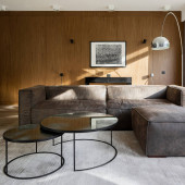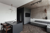 Stylowa sypialnia z betonową ścianą i łazienką z szafą za otwartymi białymi drzwiami wysoko do sufitu