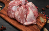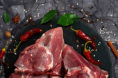 Świeże surowe mięso na starej drewnianej desce z przyprawami. Mięso ze steków jagnięcych bez kości