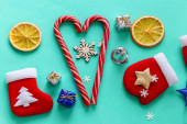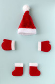 Boże Narodzenie płaski leżał na zielonym tle z filcu buty, pomarańczowy, prezenty i rękawice.