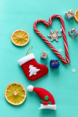 Boże Narodzenie płaski leżał na niebieskim tle z filcu buty, pomarańczowy, prezenty i rękawice.