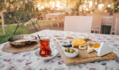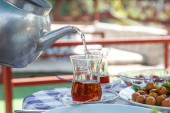 Mężczyzna wlewa herbatę z czajnika do tradycyjnej tureckiej szklanki na tarasie restauracji w malowniczym ogrodzie.