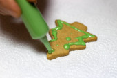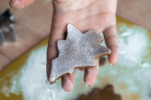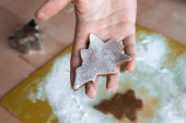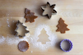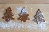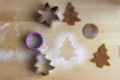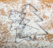 Brązowe ciasto imbirowe wycięte w bożonarodzeniowe formy drzew posypane mąką leży na stole