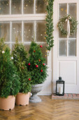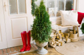 Zdjęcie "Choinki w garnkach w pobliżu domu i torba Świętego Mikołaja z prezentami" może być wykorzystywane do celów osobistych i komercyjnych zgodnie z warunkami zakupionej licencji Royalty-free. Obraz jest dostępny do pobrania w jakości wysokiej rozdzielczości do 5760x3840.