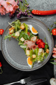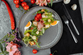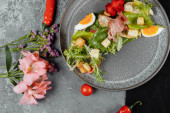 Zdjęcie "wędzona sałatka z kurczaka na czarnym talerzu." może być wykorzystywane do celów osobistych i komercyjnych zgodnie z warunkami zakupionej licencji Royalty-free. Obraz jest dostępny do pobrania w jakości wysokiej rozdzielczości do 5760x3840.