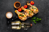 Połówki apetycznego grillowanego soczystego kurczaka ze złotą brązową skórką, serwowane z plastrami cytryny, sosem z grilla i rozmarynem.