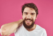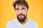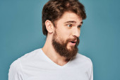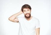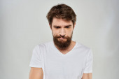 Brodaty mężczyzna w białej koszulce gest z rękami emocje lekkie tło