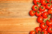 Świeże dojrzałe pomidory na drewnianym stole, płaskie układanki. Miejsce na tekst