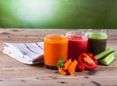 Pyszne soki warzywne i świeże składniki na szarym stole