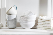 Zdjęcie "Zestaw czystych naczyń i kieliszków do wina na białym stole w pomieszczeniach. Miejsce na tekst" może być wykorzystywane do celów osobistych i komercyjnych zgodnie z warunkami zakupionej licencji Royalty-free. Obraz jest dostępny do pobrania w jakości wysokiej rozdzielczości do 5760x3840.