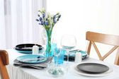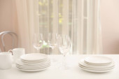 Zestaw czystych naczyń, sztućców i kieliszków do wina na szarym stole w pomieszczeniu. Miejsce na tekst