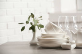 Zdjęcie "Zestaw czystych naczyń i kieliszków do wina na białym stole na rozmytym tle. Miejsce na tekst" może być wykorzystywane do celów osobistych i komercyjnych zgodnie z warunkami zakupionej licencji Royalty-free. Obraz jest dostępny do pobrania w jakości wysokiej rozdzielczości do 5760x3840.