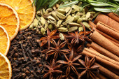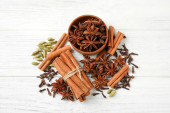 Kompozycja płaska z grzanymi składnikami wina na drewnianym stole