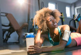 młoda Afroamerykanka w sportowej odzieży trzymająca matę do jogi i butelkę wody na świeżym powietrzu w parku o wschodzie słońca