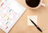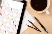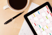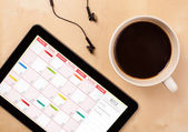 Tablet pc kalendarz wyświetlone na ekranie przy filiżance kawy na d
