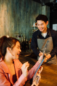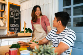 Zdjęcie "Azji para mając romantyczny moment w kuchni podczas ich dziecko patrząc na nich." może być wykorzystywane do celów osobistych i komercyjnych zgodnie z warunkami zakupionej licencji Royalty-free. Obraz jest dostępny do pobrania w jakości wysokiej rozdzielczości do 5760x3840.