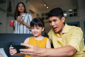 Zdjęcie "Azji rodzina biorąc selfie portret ze smartfonem w domu." może być wykorzystywane do celów osobistych i komercyjnych zgodnie z warunkami zakupionej licencji Royalty-free. Obraz jest dostępny do pobrania w jakości wysokiej rozdzielczości do 5760x3840.