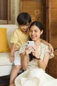 Azji rodzina biorąc selfie portret ze smartfonem w domu.