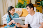 Zdjęcie "Azjatycka rodzina w salonie. Matka i córka oglądają film na laptopie. Ojciec rozmawia przez telefon.." może być wykorzystywane do celów osobistych i komercyjnych zgodnie z warunkami zakupionej licencji Royalty-free. Obraz jest dostępny do pobrania w jakości wysokiej rozdzielczości do 5760x3840.