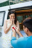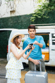 Azji matka i dziecko patrząc na zrzut ekranu na smartfonie wewnątrz pojazdu rekreacyjnego.