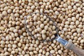 Świeże nasiona soi w drewnianej łyżeczce do projektowania w pracy.