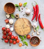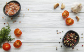 Pomidor, bazylia i pieprz z czosnkiem na białym drewnianym tle