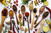 Różne przyprawy izolowane na białym tle, widok z góry