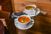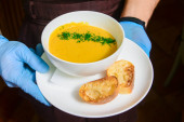 Miska świeżej zupy z pietruszką. Kelner serwujący obiad w restauracji lub jadłodajni, pyszna gorąca zupa. Koncepcja jedzenia, kelner w pracy.