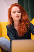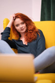 Zrelaksowana kobieta pracująca w domu na laptopie.