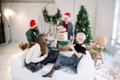 Wesoły duży śmiech europejskiej rodziny z dziadkami otwierając prezenty świąteczne, siedząc w przytulnym świetle urządzony pokój z dużymi oknami i choinką