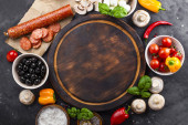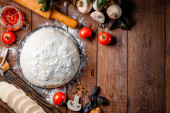 Składniki do produkcji pizzy - ciasto, ser mozzarella, pomidory, grzyby i bazylia na drewnianym tle. Wolne miejsce na tekst. Wysokiej jakości zdjęcie