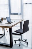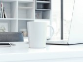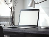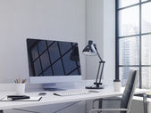 Biały komputer i laptop z dużym białym monitorem w nowoczesnym, stylowym biurze. Powrót Widok. Renderowanie 3D. Odbiór. Puste miejsce