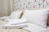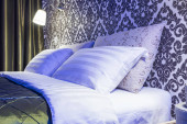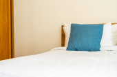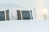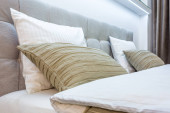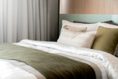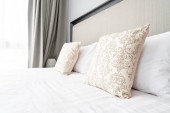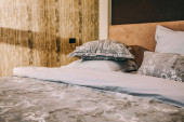 Poduszki na głównym łóżku we wnętrzu nowoczesnej luksusowej sypialni w apartamentach typu studio w jasnym kolorze