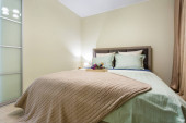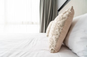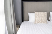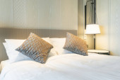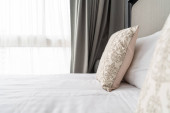 Poduszki na głównym łóżku we wnętrzu nowoczesnej luksusowej sypialni w apartamentach typu studio w jasnym kolorze