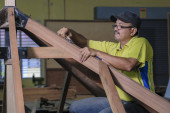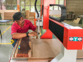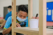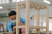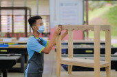 Młody stolarz w ubraniu roboczym i masce do twarzy przy użyciu wypełniacza do drewna w pracach wykończeniowych stołu konsolowego .