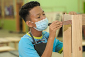 Zdjęcie "Młody stolarz w ubraniu roboczym i masce do twarzy przy użyciu wypełniacza do drewna w pracach wykończeniowych stołu konsolowego ." może być wykorzystywane do celów osobistych i komercyjnych zgodnie z warunkami zakupionej licencji Royalty-free. Obraz jest dostępny do pobrania w jakości wysokiej rozdzielczości do 5760x3840.