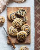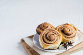 Cynamonowe bułeczki. Domowej roboty bułeczki cynamonowe na talerzu na lekkim rustykalnym tle, ostrość selektywna.