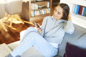 Zdjęcie "Piękna młoda kobieta w piżamie siedzi rano w łóżku, rozciągając i trzymając budzik po przebudzeniu." może być wykorzystywane do celów osobistych i komercyjnych zgodnie z warunkami zakupionej licencji Royalty-free. Obraz jest dostępny do pobrania w jakości wysokiej rozdzielczości do 5760x3840.