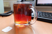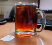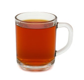 przezroczysty kubek z czarną herbatą na białym tle.