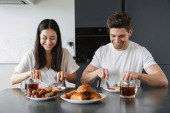 Zdjęcie "Zdjęcie wesołej młodej kochającej pary w domu jedzącej śniadanie" może być wykorzystywane do celów osobistych i komercyjnych zgodnie z warunkami zakupionej licencji Royalty-free. Obraz jest dostępny do pobrania w jakości wysokiej rozdzielczości do 5760x3840.