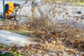 Zdjęcie "Człowiek z dmuchawy liści spadł jesienią liście w stoczni turbiny wiatrowej" może być wykorzystywane do celów osobistych i komercyjnych zgodnie z warunkami zakupionej licencji Royalty-free. Obraz jest dostępny do pobrania w jakości wysokiej rozdzielczości do 5760x3840.